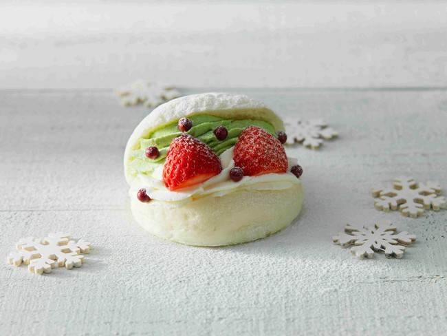 北海道産の生クリームを、おいしく食べてほしいという想いで創った大人気「生クリームバーガー」のクリスマススイーツです。くちどけなめらかなパンに特製生クリームとピスタチオクリームを絞り、苺をトッピングしました。