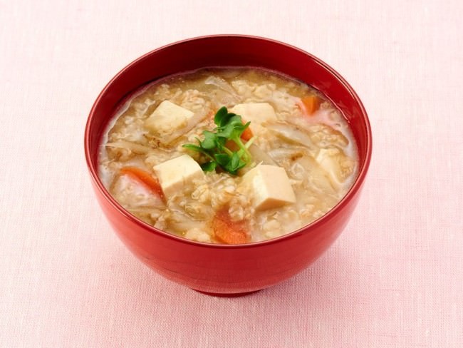 ③具材に火が通ったら、オートミールと合わせ味噌で味をつけて仕上げます。