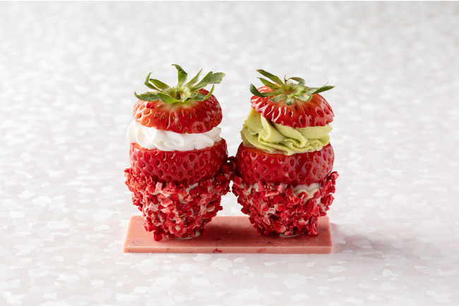 使用するいちごは約7cmの特大サイズ。器に見立てたいちごの中身をくり抜き、自家製苺ジャムを流し入れ、1つには練乳と生クリームの特製クリームを、もう1つにはピスタチオクリームをトッピングしたインパクト抜群のアイテム。下半分にはカリカリとした食感が楽しいフリーズドライのいちごをまぶしており、様々な味わいを一度に楽しめるスイーツです。