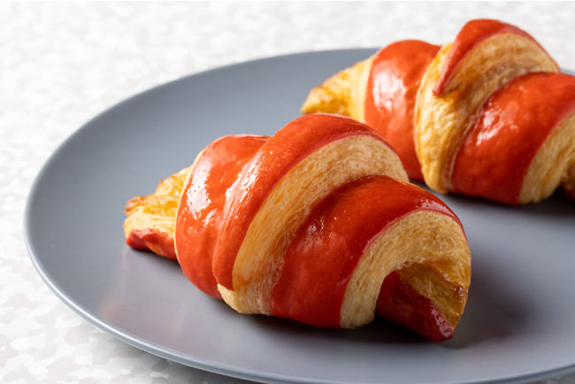 ブティックのショーケースに並ぶヴィエノワズリー(菓子パン)シリーズの新作、いちご風味のクロワッサンです。真っ赤なラインが生地の中まで通っておりベリー風味がずっと楽しめる上、ちぎって食べても可愛らしいクロワッサンです。