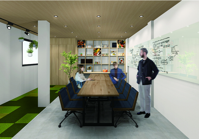 2Fは15名程度を収容できるコミュニティスペース。打ち合わせや商談、展示会、セミナーのほか、1Fのキッチンと併せて利用することで、試食や試作を伴う打ち合わせや新商品の開発などに活用いただけます。