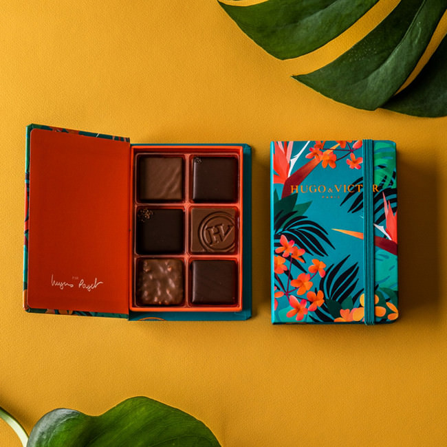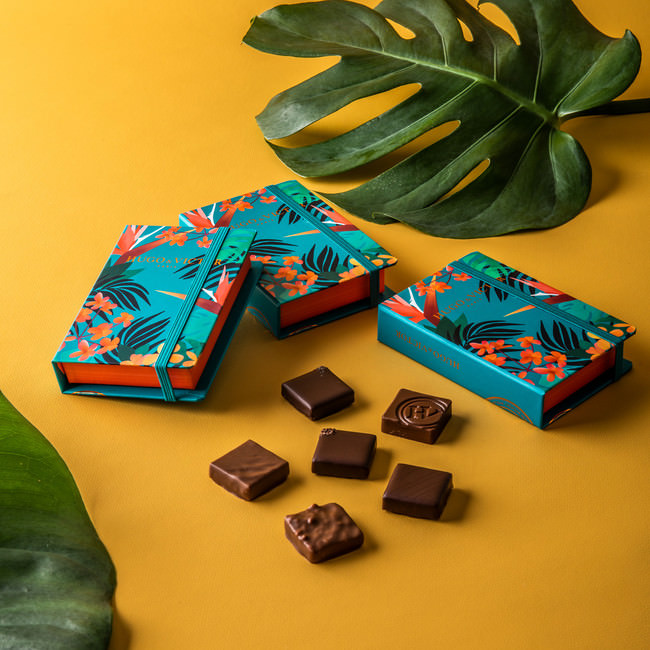 カカオの生産者や生産地への敬意をこめて、カカオの育つ熱帯のジャングルをイメージしたカルネ。このカルネにはユーグ・プジェシェフのこれまでのコレクションの中から、大好きなものばかりをアソートしました。特にサントドミンゴのカカオとマダカスカルバニラのガナッシュはシェフのお気に入りであり、特に感謝の気持ちを込めて作ったショコラです。