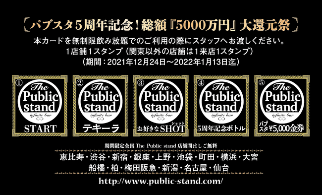 株式会社セクションエイト(所在地:東京都渋谷区、代表取締役社長:安田 隆之)が運営するBAR「The Public stand」(通称:パブスタ)は開業から5周年を記念し、日頃から支えていただいているお客様への総額5,000万円をかけたキャッシュバック企画を実施することをお知らせします。