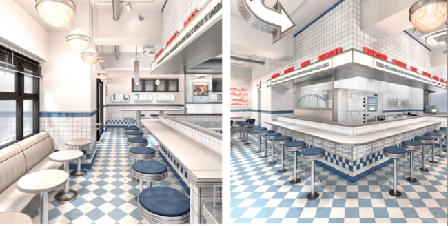 50年代のアメリカンダイナーをモダンにアレンジ。ポップながらほどよく落ち着いた雰囲気が魅力の店内は広々と55席。ゆっくりグルメバーガーを堪能できます。オープンキッチンとなっている為、ジューシーなパティを焼き上げる香りに、食欲がかき立てられます。