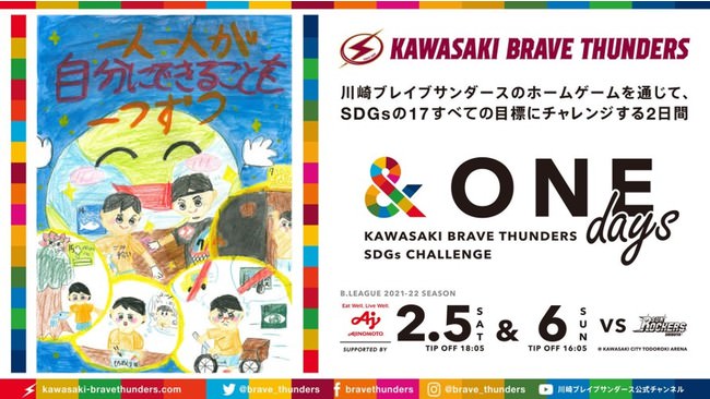『&ONE days』は昨シーズンに続き2回目の開催となり、川崎ブレイブサンダースが日頃メインターゲットにして取り組んでいる3つのSDGs目標「3.すべての人に健康と福祉を」「8.働きがいも経済成長も」「11.住み続けられるまちづくりを」だけではなく、この2日間は&ONEオフィシャルパートナーに就任した味の素㈱との取り組みをはじめ、ご来場いただいた皆さまにSDGsについて学び、興味を持っていただくだけではなく参加していただけるような様々な取り組みをご用意し、17すべての目標にチャレンジいたします。