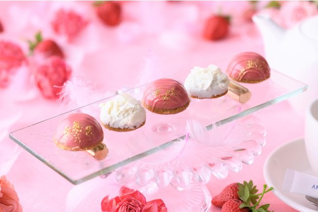 「ストロベリーソースとわたあめのフロマージュムース」「イチゴとバニラムースのクレープ」「ストロベリーマカロン」「ストロベリームース」といったパティシエ自慢の贅沢なデザートに心が躍ります。華やかな苺の味わいをお楽しみください。