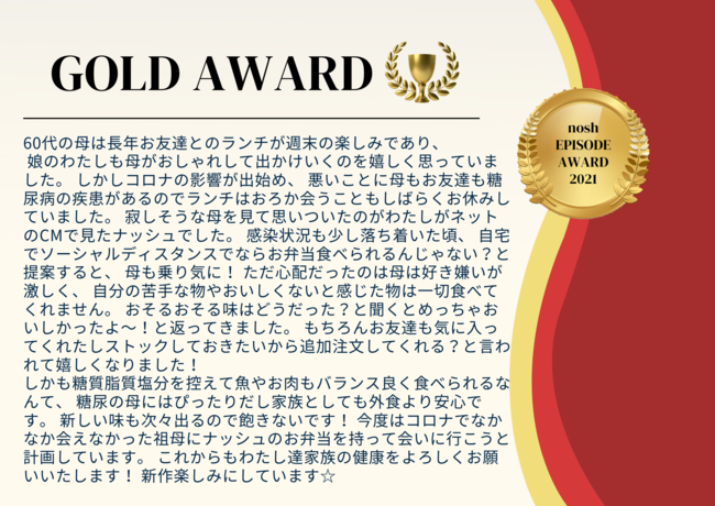 コロナの影響でお母様の楽しみが減ってしまった状況で、体調を考えながらご提案をされた素晴らしいエピソードだと思いグランプリに選びました。好き嫌いが多いお母様にも気に入っていただき光栄です。