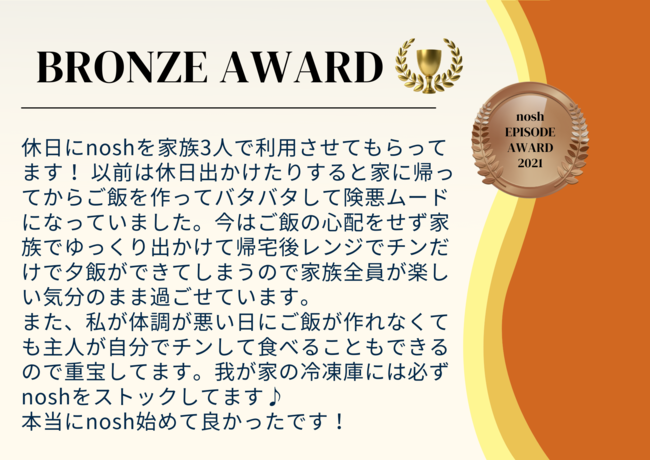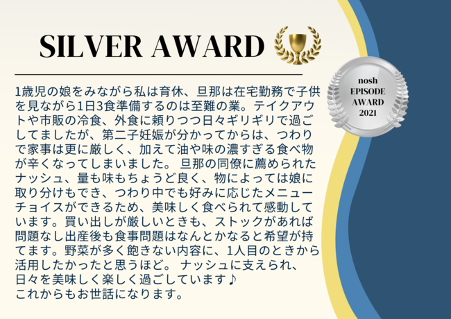 子育てを行いながら、つわりの想像を絶する大変さお察しいたします。体調の関係で食べられる物とそうでないものがある中で、「nosh」の強みでもある全て好きなメニューを選べるシステムで栄養管理や時短が可能になっただけではなく、安心感をも感じてくださったことが受賞理由となりました。
