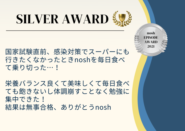 国家試験合格、誠におめでとうございます!大切な試験前にお役立てくださりありがとうございました。さらに無事に合格されたとのことで、この度の受賞となりました。試験や受験前の大切な時間の栄養サポート、またお夜食のお共にも罪悪感が少なく食べられるので、noshは最適かとおもいます。
