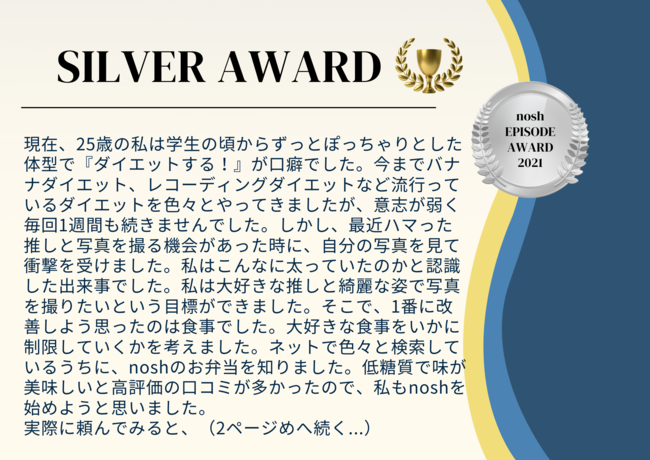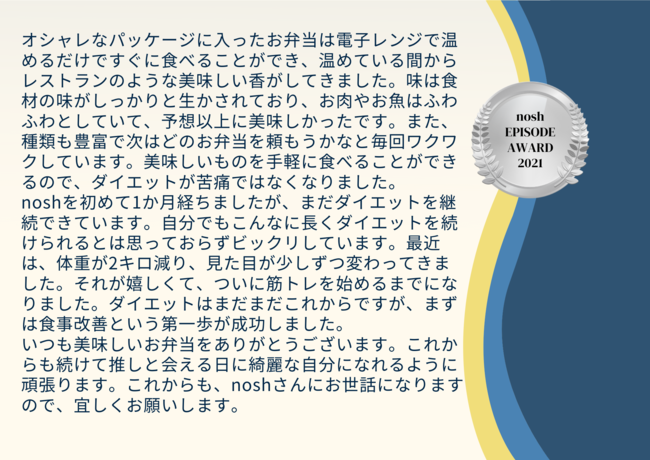 美味しく栄養管理ができる冷凍宅食サービスのパイオニア「nosh-ナッシュ」は、第1回 noshエピソード AWARD 2021を開催し、noshにまつわるエピソードをTwitterとインスタグラムで募集いたしました。この度、受賞者が発表されましたことをお知らせいたします。