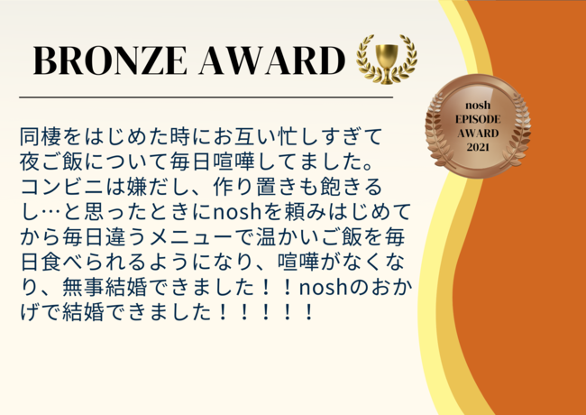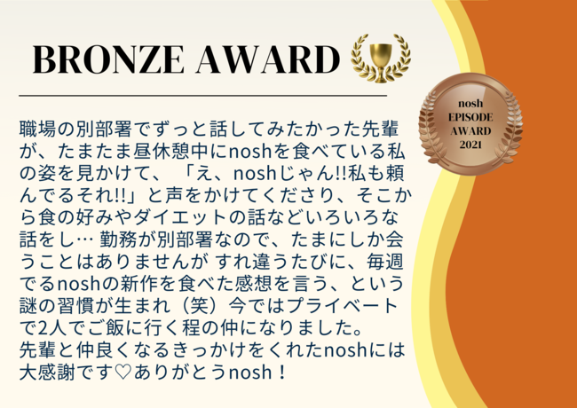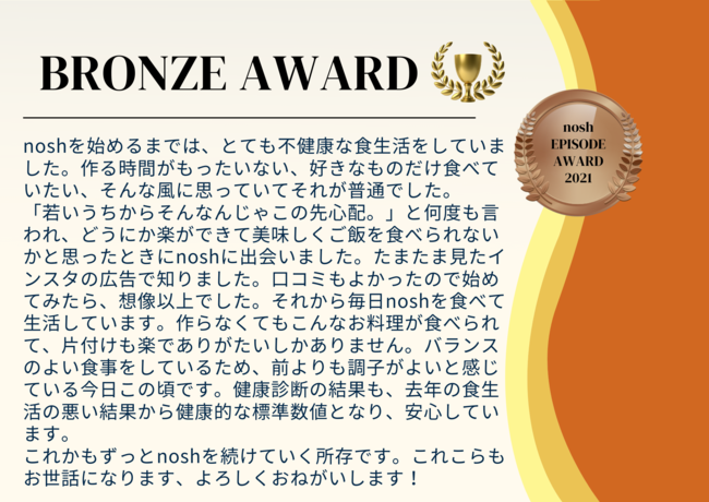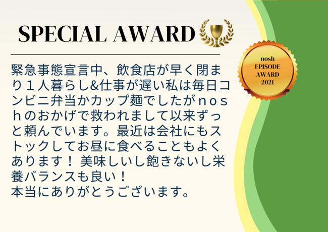 コロナウィルス感染拡大の影響で、2021年もおうち時間が長く続きました。緊急事態宣言で「外食難民」なども話題となりましたが、そんな中noshは「健康」や「ダイエット」の観点だけではなく、「時短」「感染予防」「フードロス」の観点でも幅広くご活用いただきました。2021年noshをご利用いただいた皆様へ感謝の気持ちと、更に必要とされ続けるサービスとなるよう「noshエピソード AWARD 2021」を開催する運びとなりました。