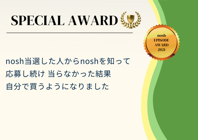 noshをご利用いただいたことがあるユーザーの方を対象に、2021年にあったnoshにまつわるエピソードを募集し、ご応募いただいたエピソードから、審査の上、グランプリ・準グランプリ・準々グランプリ・特別賞を決定します。