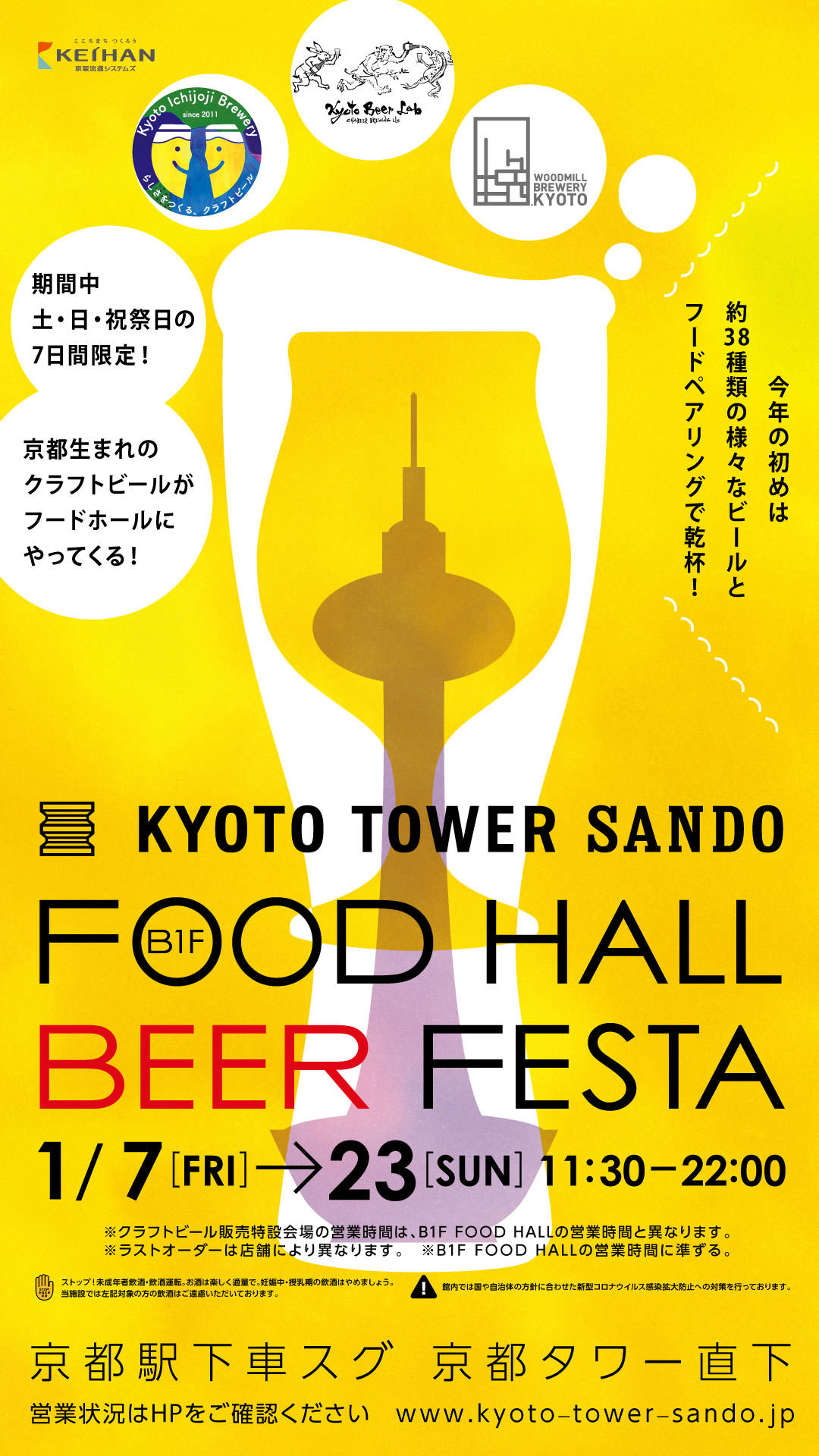 株式会社京阪流通システムズ(本社:大阪市中央区、代表取締役社長:松下靖)が運営する「京都タワーサンド(京都市下京区)」では、2022年1月7日(金)~23日(日)の期間、B1Fにて『FOOD HALL BEER FESTA』を開催いたします。約1年ぶりの開催となる『FOOD HALL BEER FESTA』は、FOOD HALL内の各店が提供する約35種類のビールに加え、期間中の土曜・日曜・祝祭日の7日間限定で京都のクラフトビールをお楽しみいただけます。中央特設ブースにて週替わりで3つの京都クラフトビールのブルワリーが登場いたします。