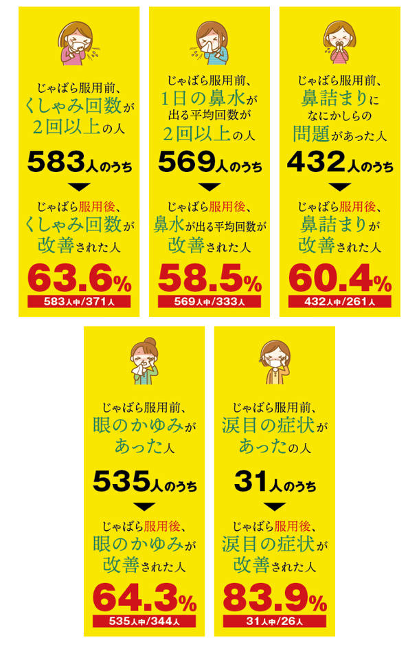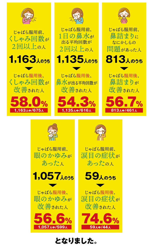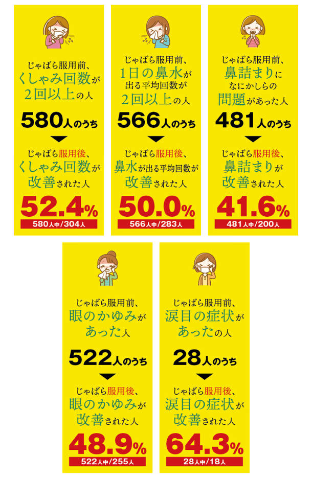 また、じゃばらが少しでも効いたという方1,240人の症状別改善度アンケートの結果では、全症状で半数以上の方が、改善されたという結果となりました。