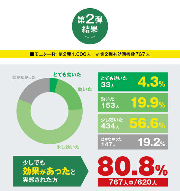 続いて2回目の調査(モニター期間:3月中旬頃)では、少しでも効いたと回答された方が、有効回答数767人のうち620人と、80.8%の方が花粉症に何かしらの効果を実感したという結果になりました。
