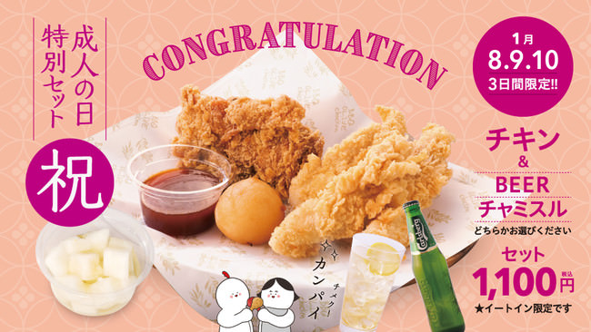 また、本販売を記念しましてアルコールにもよく合う「オリーブチキン(1pc)」「チキンフィンガー(3本)」「チーズボール(1個)」「ラディッシュピクルス」に選べるアルコールドリンク「チャミスルレモネード」or「カールスバーグ」をセットにしました成人の日特別セットを1100円(税込)にて1月8日(土)~10日(月)までの期間限定で販売いたします。
