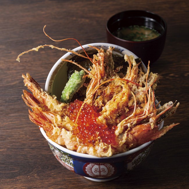 豪快に有頭の大海老を3尾盛り付け、いくらで華やかに仕上げた冬の贅沢天丼です。