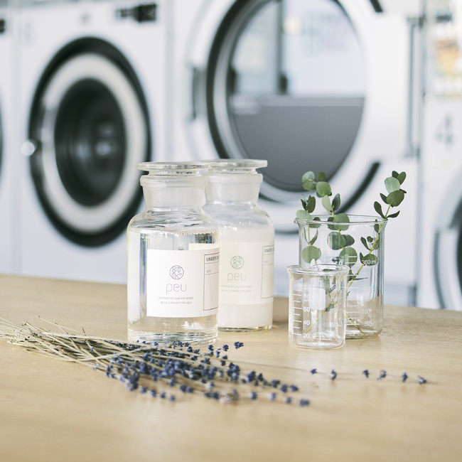 「衣類に、肌に、環境に優しく」あることを目的に、ヤシ油由来の原料を使用してつくられたオリジナルの洗剤・柔軟剤『peu』で洗い、乾燥します。『peu』は洗剤成分が繊維に残りにくいため、素材の風合いを損ねることなく、洗濯物をすっきりと洗い上げます。柔軟剤にはラベンダーとユーカリの天然香料を使用しています。