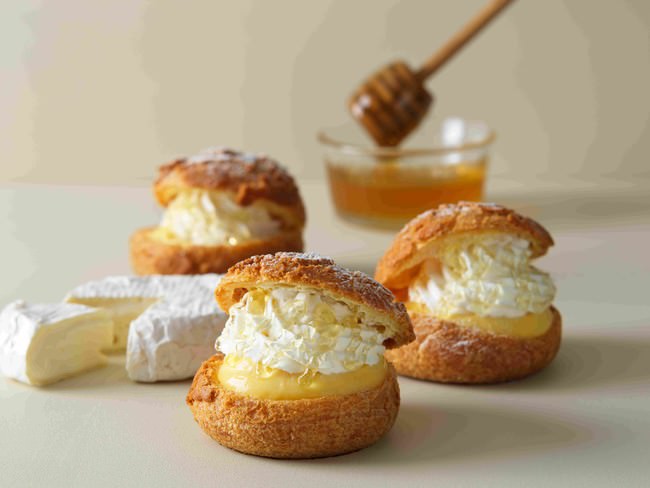 2種のチーズクリームをチーズクッキーシューでサンドしたツインチーズシュークリームです。一番人気のチーズクッキー「ゴーダ&チェダー」生地をシューと一緒に焼き上げ、カマンベールカスタードとあっさりとしたクリームチーズシャンティを絞りサンドし、はちみつジュレをトッピング。大宮店限定のスイーツです。