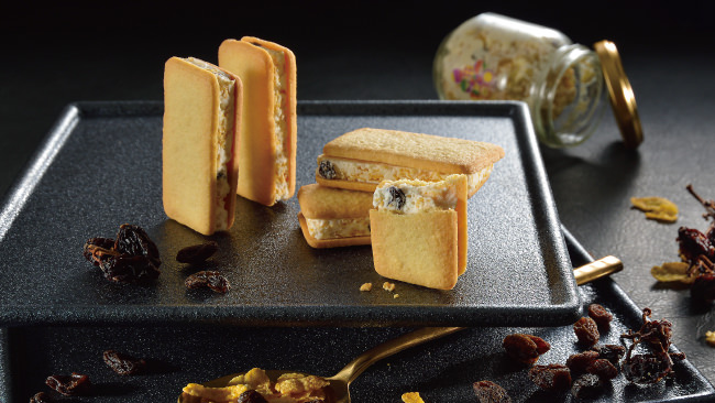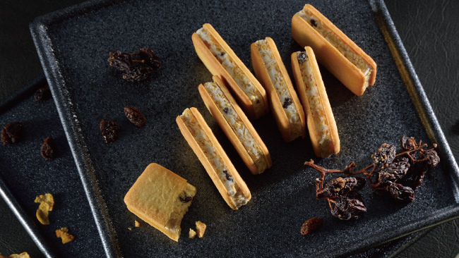 風味豊かな香りのざくざくレーズンサンドクッキー。レーズン入りのホワイトチョコを六甲山麓牛乳を使用したバタークッキーでサンドしました
