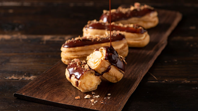 たまごの素材本来のよさを引き立たせた、とろ~りなめらかカスタードクリームをサンドし、ベルギー産チョコレートの上に山の恵である木の実をたっぷりとまとった香ばしい味わいのエクレア
