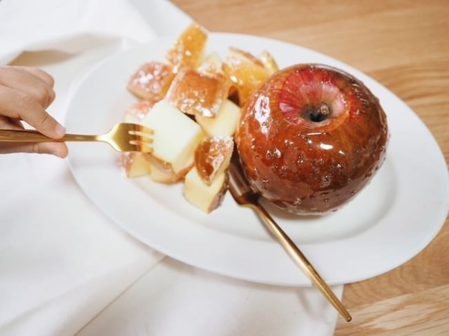 りんごの風味によって甘く濃厚な飴でりんごとの相性もばっちりです。薄く飴をつけることで、カットしてもはがれにくく、表面はパリパリした食感となります。