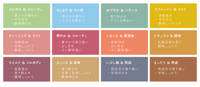 これらのデータと、各サンプルのアルコール度数などのデータを元に統計解析を行った結果、市販の日本酒を以下の12タイプに分類できました。それぞれのタイプには、味わいをイメージしやすくすることを目的として、一般的な単語だけを用いて名称を設定しています。