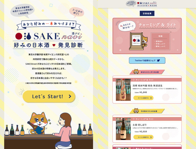 日本酒スタートアップ・酒ストリート株式会社(本社:東京都台東区、代表取締役:藤田 利尚、以下「当社」)は、機械学習結果を活用し、好みの日本酒を手軽に判定できるWebサービスをリリースしました。東京大学大学院農学生命科学研究科・石島智子特任助教(食品機能学研究室)および阿部啓子特任教授(味覚サイエンス研究室)との共同研究により収集したデータを用い、当社が機械学習を活用して構築した判定プログラムを用いることで、精度の高い判定を可能としています。