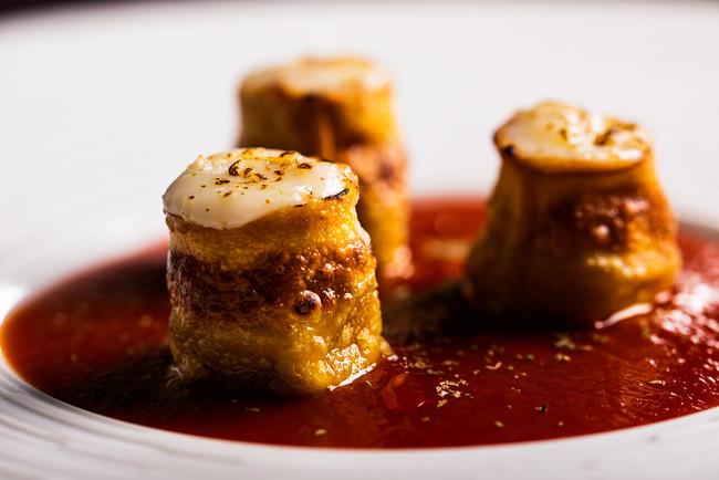 ・タラのファゴッティーノ トマトのコンフィ、モッツァレラチーズのお水とバジルオイル ※ファゴッティーニ(パスタ生地で包んだもの)