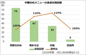 焼きそばや肉野菜炒めなど、中華料理店で人気の炒めメニューは、家庭でも手軽に調理できていろいろな食材が摂れることから、コロナ禍の影響もあり食卓出現回数が増えています(出典:株式会社ライフスケープマーケティング「食MAP」、右図参照)。