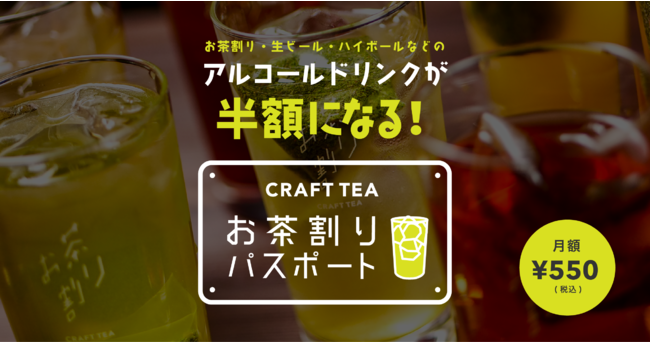 今回提供を開始する『CRAFT TEA お茶割りパスポート』は、月額550円(税込)でこの新感覚のお茶割りを半額で楽しめる、とてもお得なプランです。さらに、お茶割りだけでなく、生ビール(ザ・プレミアム・モルツ<香る>エール)や角ハイボールなど、CRAFT TEAが提供するアルコールドリンクも、すべて半額になります。