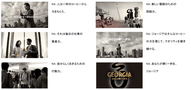 その後、コーヒー豆が弾けるカットが入り、オフィスの人々、コーヒーを注ぐカット、公園でリフレッシュする家族、音楽のセッションをして創作を楽しむ人たち、ストリートでダンスに打ち込む若者たち、仕事前にコーヒーを飲む工事現場の人たちなど、仕事や日々の生活の中で、コーヒーをきっかけに、前に進んでいく人たちのカット、そしてコーヒーの液面のカットが続き、その上に、「ジョージアはそんなコーヒーの力を信じて、そのクオリティを磨き続ける。」というメッセージが重なります。そして、場面はまた変わり、屋上に凛と立つ山田さんのシーンに。「ジョージア ジャパン クラフトマン カフェラテ」を一口飲む山田さん。そこにナレーションとタイトルで、「あなたが輝く一杯を。」というメッセージが入ります。そして、最後のカットでは、ジョージアの「O」の文字を背景に、ジョージアのロゴが決まります。