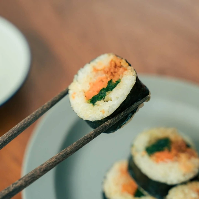 オムニミートのそぼろとナムルを海苔で巻いた韓国風プラントベース海苔巻きです。ごま油の風味とコチジャンの味がピリッと効いていますので、それぞれの具材の相性が抜群で見た目にも鮮やかです。