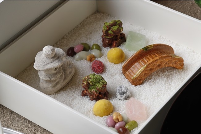 国の名勝に指定された横浜の日本庭園「三渓園」をイメージした箱庭の重。冬の雪をイメージした小石仕立ての砂糖であしらい、抹茶の粉をふり、苔むした岩に見立てたチョコブロックと共にお楽しみください。