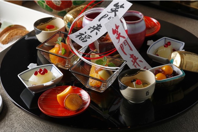 漆黒の島台に、お多福、金俵などの小皿をあしらった、福招きの「笑門来福」。めでたい七福の甘味を、福をとりながら召し上がってください。体にも優しい素材を生かした和スイーツは、笑みがこぼれ福を招くはずです。