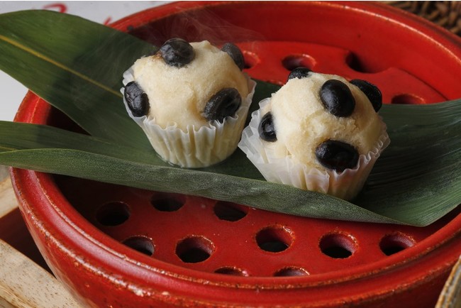 朱色の焙烙(ほうろく)蒸し器でサーブされる黒豆の蒸しパンは、ふっくらと艶やかな黒豆が滋味深い味わいです。