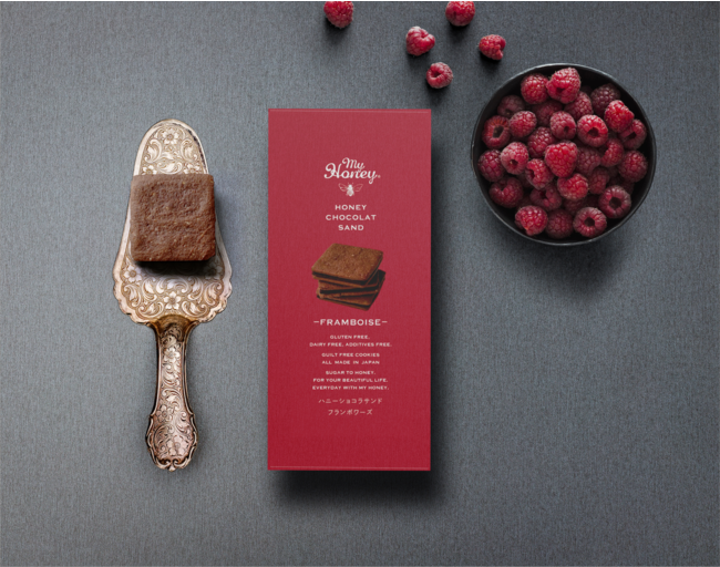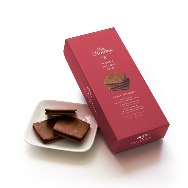 そんな想いから、MYHONEYは一般的なチョコレートに使用する乳製品・砂糖・化学物質をカット。生はちみつの優しい甘さで仕上げたチョコクッキーサンドの新商品「ハニーショコラサンド フランボワーズ」をつくりました。濃厚なハニーチョコレートと甘酸っぱいフランボワーズの相性は抜群!