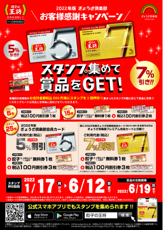 「餃子の王将」を運営する株式会社王将フードサービス(京都市山科区/代表取締役社長 渡邊 直人)は、2022年1月17日より、スタンプを集めて各種割引券やお会計が割引になる会員カードがもらえる「2022年版ぎょうざ倶楽部 お客様感謝キャンペーン」を実施します。