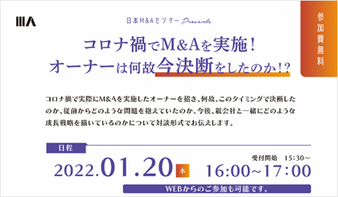 株式会社日本M&Aセンター(以下、日本M&Aセンター、本社:東京都千代田区 / 代表:三宅 卓 / URL:https://www.nihon-ma.co.jp/)は、食品業界に特化したセミナー「新春業種特化セミナー コロナ禍でM&Aを実施!オーナーは何故今決断をしたのか!?」を2022年1月20日に東京会場およびオンラインにて開催いたします。