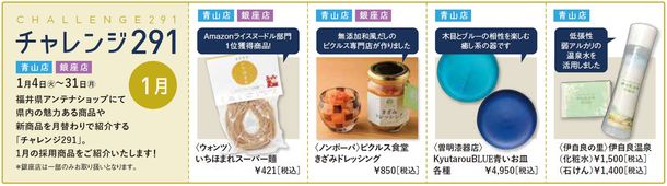 「チャレンジ291」は、福井県アンテナショップにて県内の魅力ある商品や新商品を月替わりで紹介する特設コーナーです。福井県産品の知られざる魅力や、注目の新商品を「チャレンジ291」特設コーナーにて発信しております。