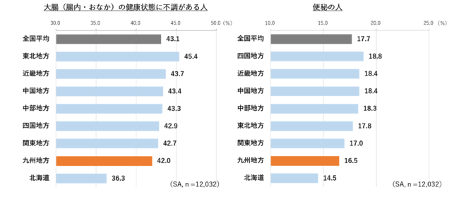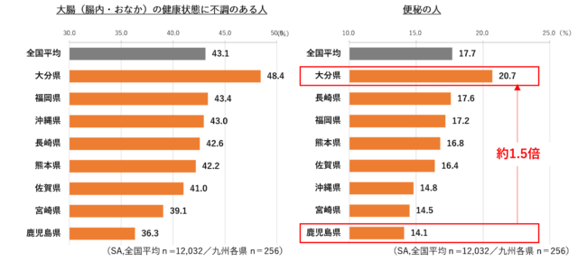 ①九州地方全体では「大腸に不調がある人」も「便秘の人」も全国平均並み。