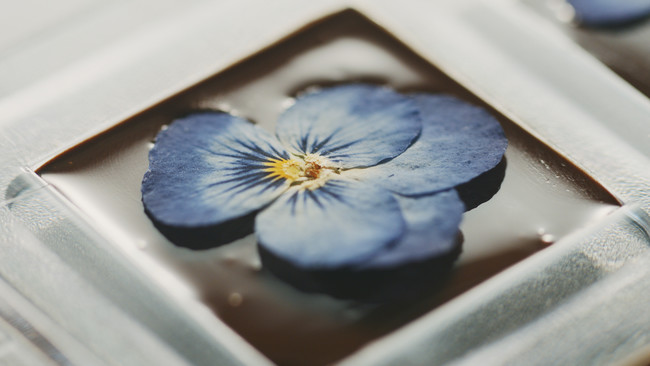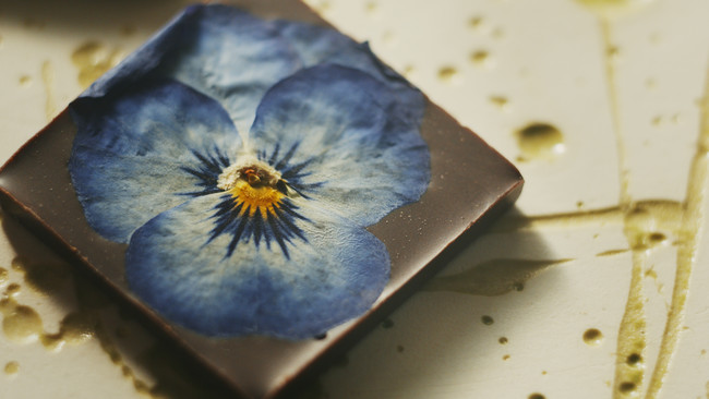 チョコレートの上に乗せたのは食べられる花屋EDIBLE GARDENによるエディブルフラワーの押し花。農薬、化学肥料、重機や暖房機器による化石燃料を使わない地球環境に配慮した栽培のエディブルフラワーを使用しています。これをプレスした上でドライに加工したものをチョコレートにトッピングしました。おいしくて、美しいことはもちろん、背景のストーリーも一緒にお召し上がりいただけますと幸いです。