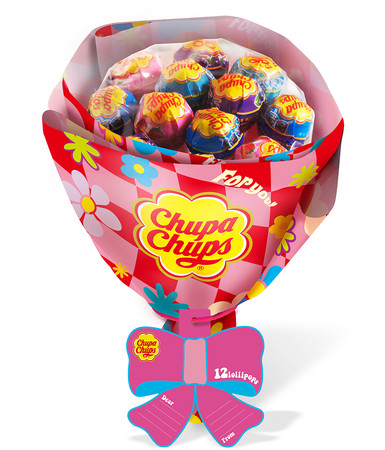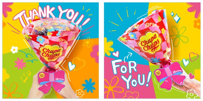 『チュッパチャプス フラワーブーケ』は、人気のフレーバー4種類(「コーラ」「ラムネ」「ストロベリークリーム」「グレープ」)を花束に見立ててアソートした商品です。今回ラッピングペーパーが、トレンドのチェッカー柄にお花のイラストや、プレゼントにぴったりなメッセージを散りばめたデザインにリニューアルします。