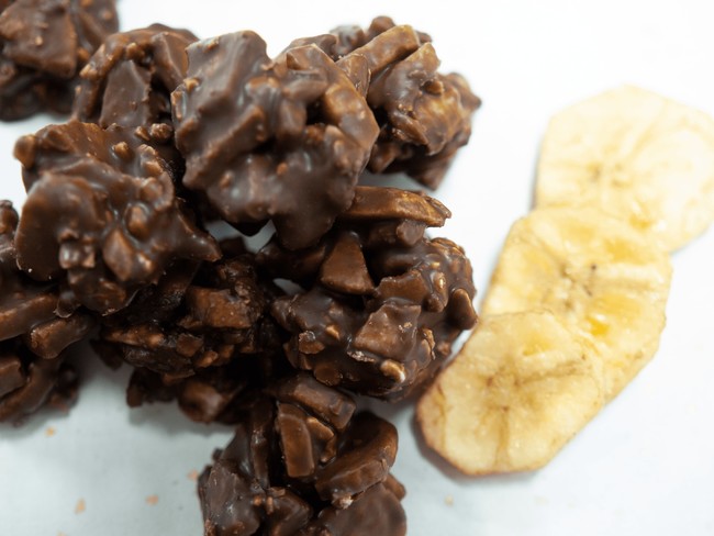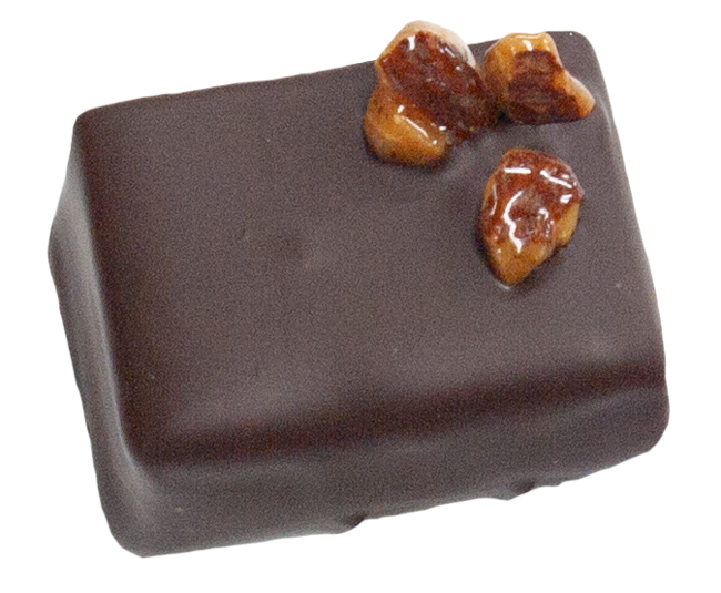 バナナ、アーモンド、プラリネ、薄くしたクレープ生地を合わせたチョコです。