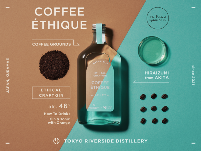 原酒には、秋田県の地酒 飛良泉の吟醸「粕取り焼酎」を使用、蒸留は Forbes Japan「30 UNDER 30 JAPAN 2021」選出の蒸留家 山口歩夢氏が監修。コーヒー豆の種類はバッチ毎に変わるため、今後様々なコーヒー豆の風味の違いが楽しめる「エシカル・ジン」となっております。