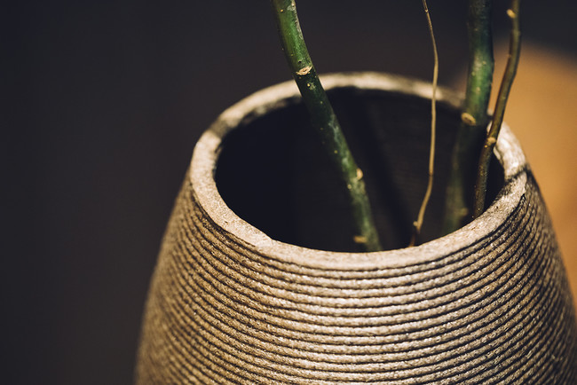 “可能性をデザインする” 株式会社NODによる、バイオマス素材 × 3Dプリンターで循環型都市を実現するプロジェクト『RECAPTURE』(https://recapture.jp)とコラボレーション。 “コーヒーかす” を素材として用いた世界初の3Dプリント家具として店舗内には花瓶を設置しています。