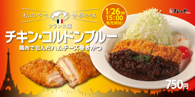 松のやで、世界の味。今回の舞台は西ヨーロッパに位置する、中世の都市・フランス。チーズをハムで巻き、さらに薄く叩いた鶏の胸肉で巻いて揚げたカツレツ。フランスでは鶏肉料理の最高峰とされ、最高の料理、または最高の料理人の代名詞である「コルドンブルー(青いリボンの意)」と呼ばれるようになったそうです。子どもから大人までみんな大好き、フランスのお母さんたちの定番家庭料理「コルドン・ブルー」。柔らかい鶏肉の中から旨味たっぷりのハムと、とろ~りチーズが溢れ出し、たまらない美味しさ。お肉にチーズにハムの黄金の組み合わせに、肉と野菜の旨味がつまった松のや特製本格ソースは相性抜群。フランスの家庭料理をお手軽にお召し上がりいただけます。