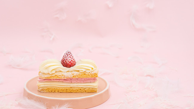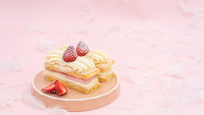 ミルクカスタードクリームと苺クリームをしっとりとしたビスキュイ生地で挟み、特製ホワイトチョコクリームを絞り真ん中に甘酸っぱい苺をトッピングしました。