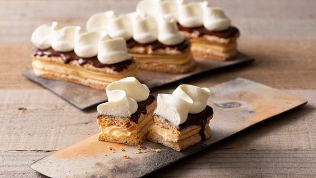 ふわふわビスケット生地でマスカルポーネ入りカスタードクリームをサンドし、ベルギー産チョコレートの上にミルク感あふれる北海道産生クリームをたっぷりしぼりました。