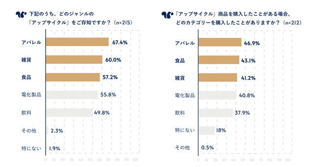 アップサイクルの意味を知っている人のジャンル別のアップサイクルの認知度を調査すると、「アパレル」67.4%、「雑貨」60.0%、「食品」57.2%の順に多い結果となりました。アップサイクル商品購入者に、購入したことのあるカテゴリーを調査すると、「アパレル」46.9% 、「食品」43.1%、「雑貨」41.2%の順に続き、アパレル・食品・雑貨の分野が、アップサイクルでは多い事がわかります。
